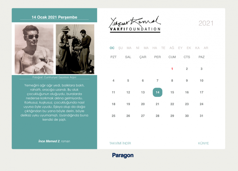Yaşar Kemal Vakfı’nın 1 Ocak sabahı sosyal medya hesapları üzerinden paylaştığı güzel gönderiyle 2021’e olan umutlarımız pekişti. Nasıl pekişmesin? O gönderi ile Yaşar Kemal temalı takvim sürpriziyle karşılaştık. Umudu en güzel kaleme alan Yaşar Kemal’in sözlerinden, alıntılarından ve onun fotoğraflarından oluşan bu güzel takvim bizleri çok mutlu etti. Ve bu işin parçası olduğum için ne kadar mutlu olduğumu tahmin dahi edemezsiniz. Şimdi adım adım bu çalışmayı inceleyelim.